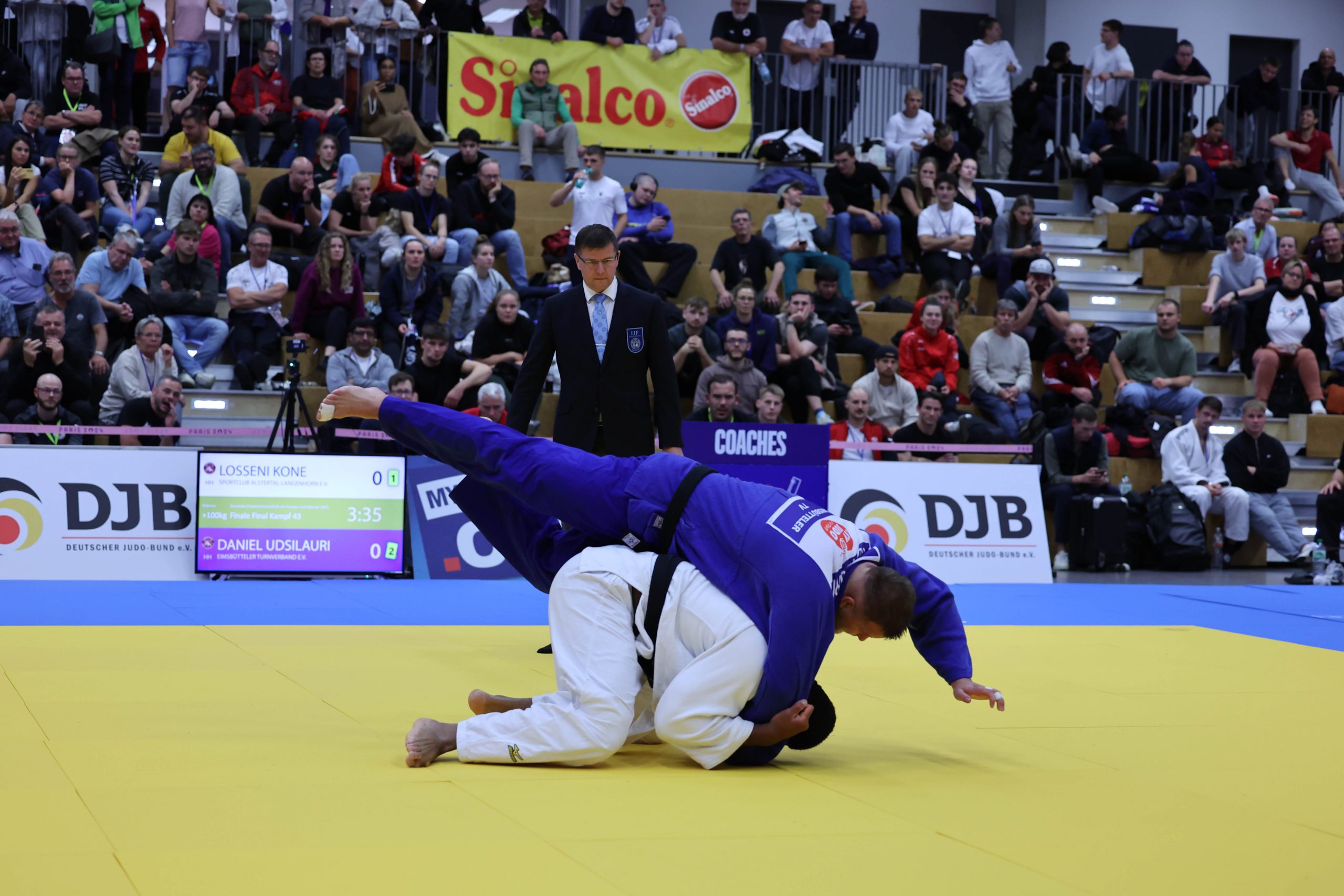 Im Schwergewicht konnte Losseni Kone seiner Favoritenrolle gerecht werden. Mit Seoi-Nage Sieg gegen Oliver Arends (FC Stella Bevergern) und einen weiteren Sieg gegen Felix Damm (TSV Kronshagen), mit De-Ashi-Barei und Haltetechnik traf er im Halbfinale auf  Nikita Nikitenko (TSV Kronshagen), den amtierenden Deutschen Meister der Junioren. Losseni schaffte nach  drei Minuten Kampfzeit, zwei Waza.ari,  den Einzug ins Finale. Daniel Udsilauri (Elmsbüttler TV), der Deutsche Meister aus 2024  forderte hier konditionell von Losseni  alles ab. Immerhin waren fast zwei Kampfzeiten, Golden Score über 3:38 Minuten, erforderlich, bis ein Sieger feststand. Ein drittes Shido beendete den Kampf zu Gunsten des Wahlberliners und brachte ihm den Meistertitel Nummer Zwei nach 2023.