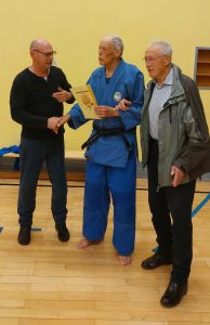 Der sichtlich überraschte Dietmar nahm die feierlich überreichte Auszeichnung, im Beisein von Manfred Künstler (8. Dan), Jörg Bühler (1. Dan) und einer Judogruppe, von Udo Strohe (Judowart des VfL Zehlendorf, 2. Dan) entgegen.